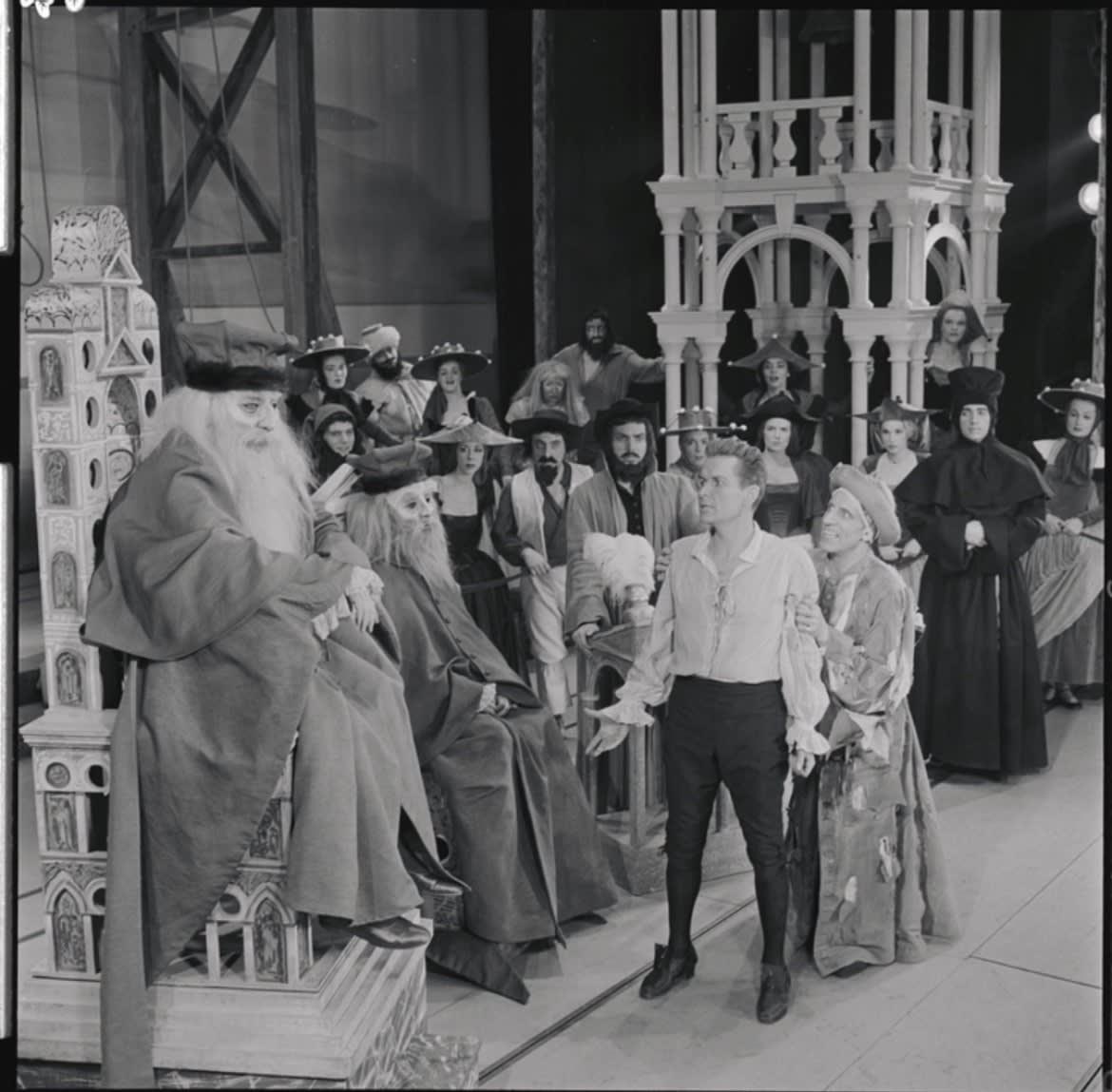 Photo 4: Production photo of Robert Rounseville, Max Adrian, and the ensemble.