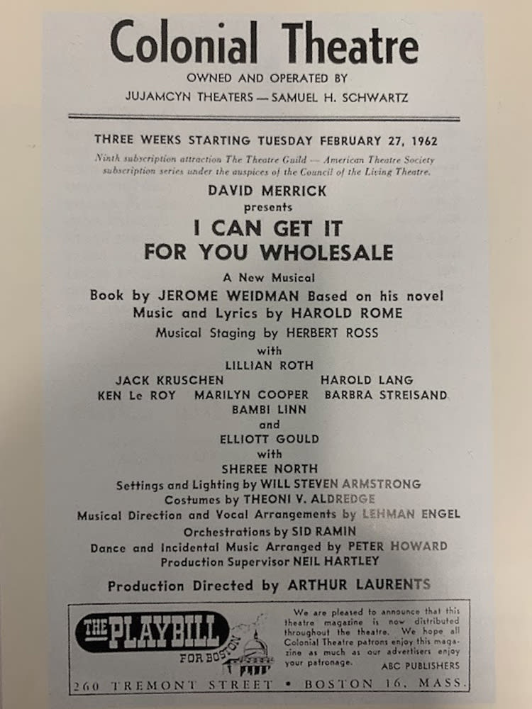 From February 27 - March 17, 1962, Boston audiences were introduced to a 19-year-old Barbra Streisand and a young Elliott Gould in the new musical I CAN GET IT FOR YOU WHOLESALE, directed by Arthur Laurents. With music and lyrics by Harold Rome and book by Jerome Weidman, based on his 1937 novel of the same title, I CAN GET IT FOR YOU WHOLESALE tells the story of an ambitious young businessman artfully clawing his way to the top of the garment industry in 1930s New York.