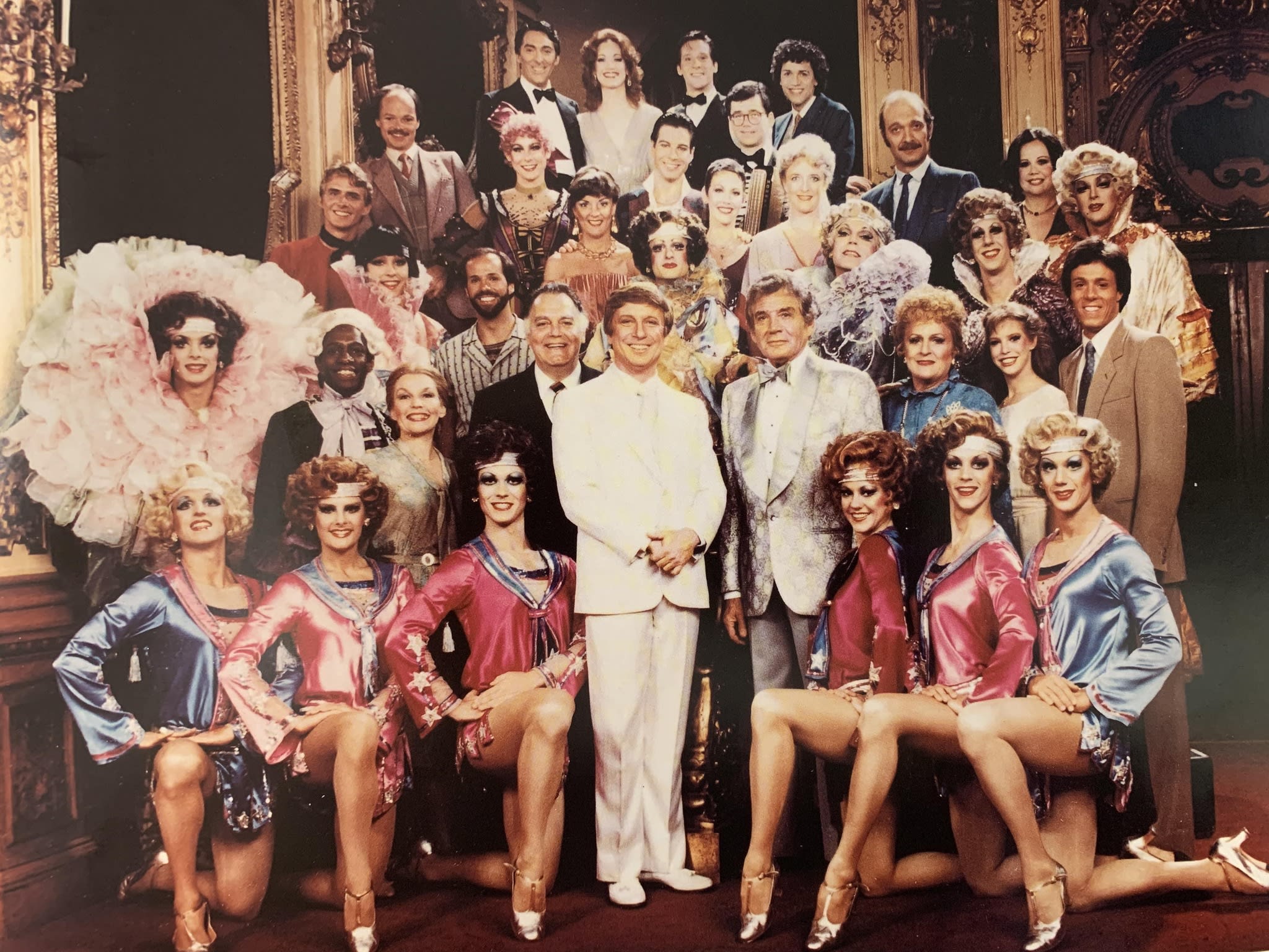 Photo: George Hearn and Gene Barry surrounded by the cast of La Cage aux Folles on the Colonial's Grand Staircase.