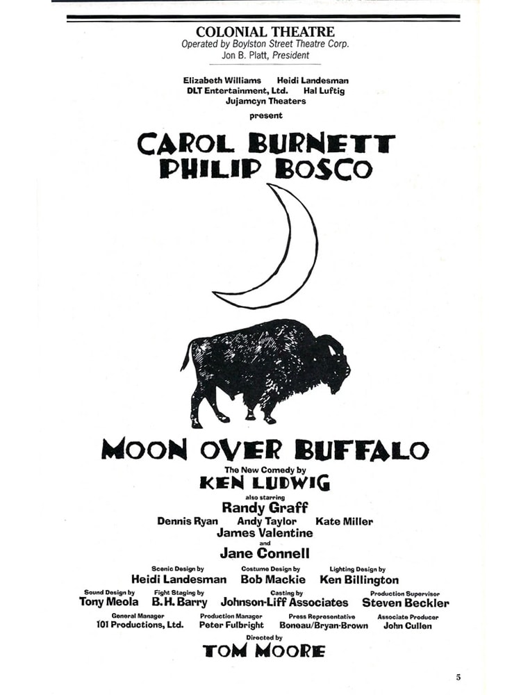 On August 15, 1995, the pre-Broadway tryout of Ken Ludwig’s uproarious MOON OVER BUFFALO opened at the Colonial. Starring Carol Burnett, Philip Bosco and Randy Graff, it marked Burnett’s return to Broadway after 30 years.