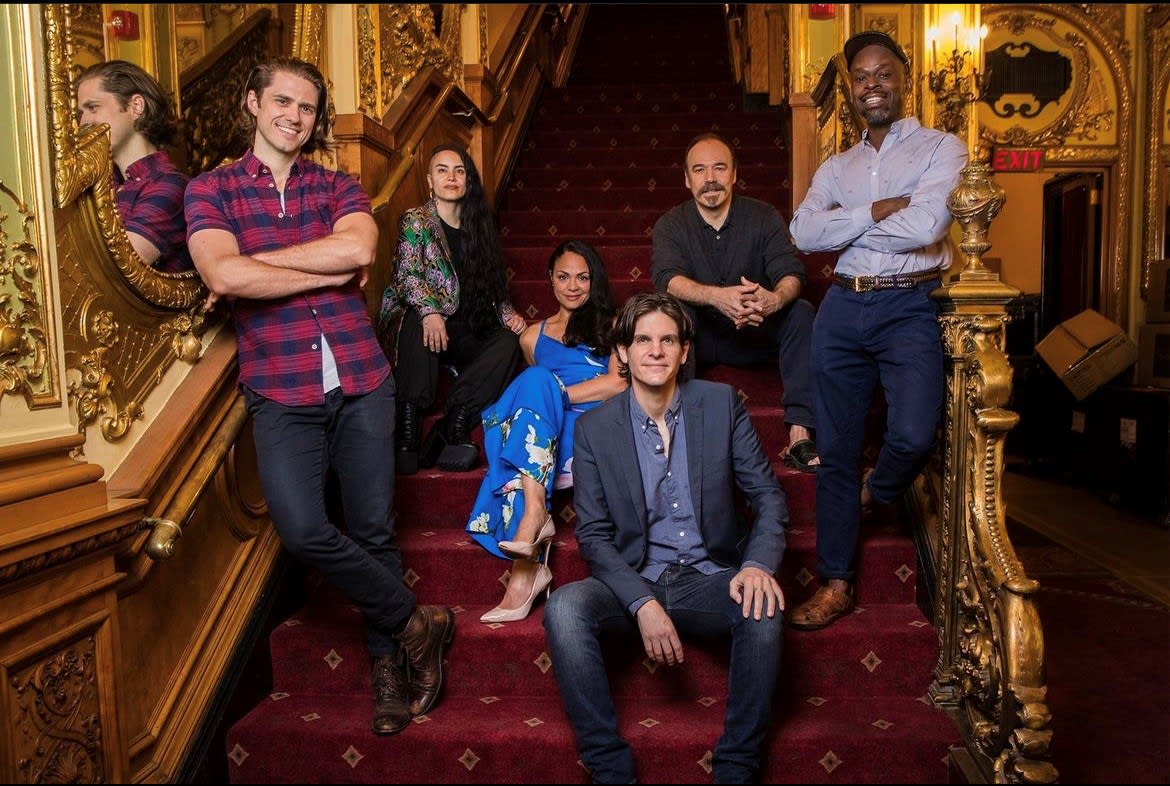 Photo 2: Director Alex Timbers (foreground center) with (from left) Aaron Tveit, choreographer Sonya Tayeh, Karen Olivo, Danny Burstein, and Sahr Ngaujah in a portrait taken for the Boston Globe on the Grand Staircase.