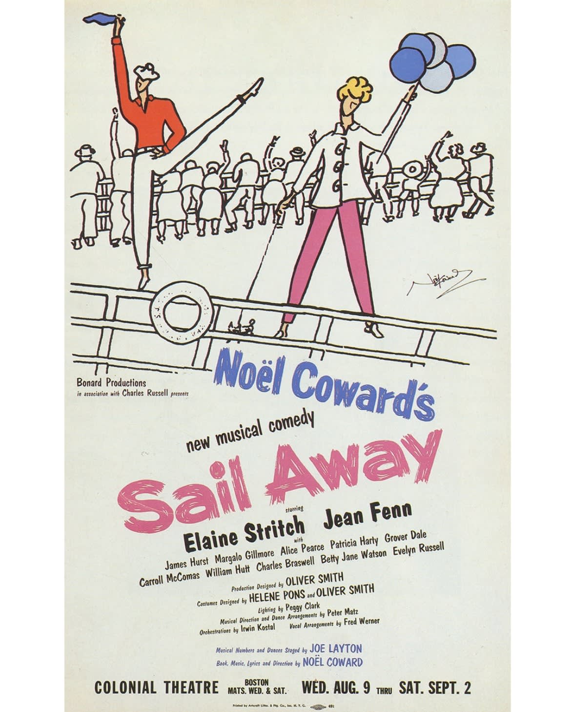 On August 9, 1961, Noël Coward’s musical comedy Sail Away began its pre-Broadway tryout at the Colonial. Coward wrote the book, music, and lyrics, and also served as the director (this was the last of his works that he directed).