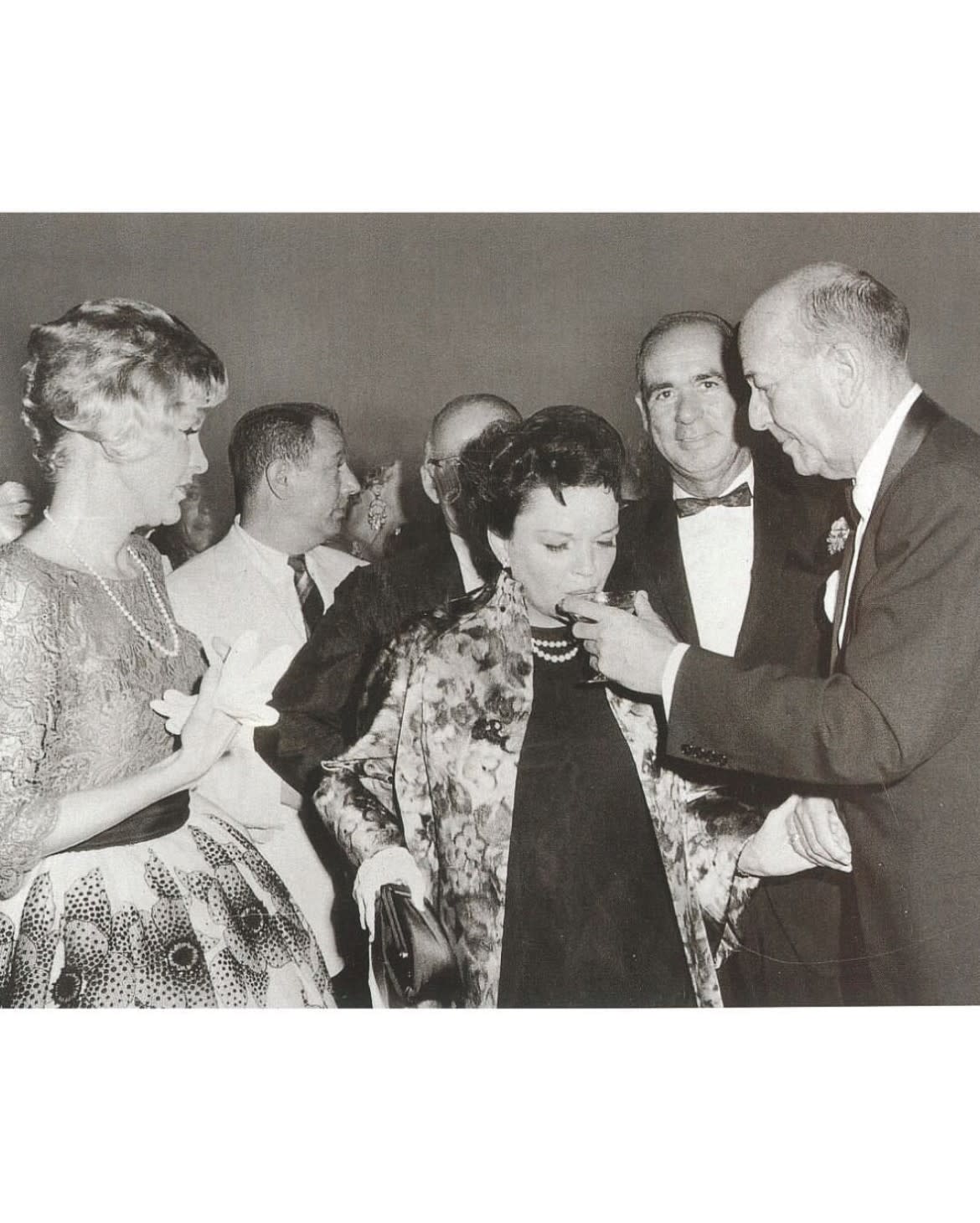 Photo 3: Hollywood actress Judy Garland after the opening night of SAIL AWAY, taking a sip of champagne from Coward, while Elaine Stritch observes them.