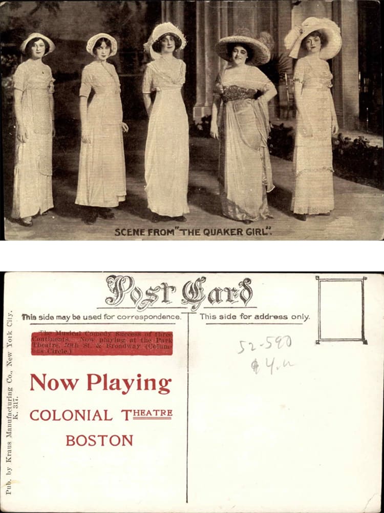 The Quaker Girl, starring Ina Claire, took to the Colonial stage in 1912. An Edwardian musical comedy in three acts, the book is by James T. Tanner, lyrics by Adrian Ross and Percy Greenbank, and music by Lionel Monckton. In its story, The Quaker Girl contrasts dour Quaker morality with Parisienne high fashion. The protagonist, Prudence, is thrown out of her house by her quaker parents for drinking a glass of champagne. Later, in Paris, her simple grey dress and bonnet become the height of fashion.